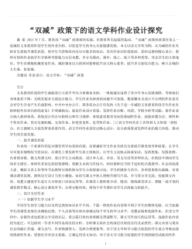 1“双减”政策下的语文学科作业设计探究摘要2021年7月,教育部“双减”政策颁布实施,在教育界引起强烈轰动。“双减”政策的重要任务之一是减轻义务教育阶段学生的作业负担,以促进学生的身心全面健康发展。本文以语文学科为例,认为减轻作业负担首先要提升课堂质量,使学生当堂吸收内化尽可能多的知识,其次作业应控量提质,需经过教师精心设计。教师可将将作业按学生学情和考察能力分层布置,并分为课内、课外,线上、线下等多种类型,突出学生的主体地位。学生在摆脱机械重复作业、减轻课业压力的同时能够提升语文核心素养,提升多方面综合能力,树立正确的人生观、价值观。关键词作业设计;语文学科;“双减”政策引言义务教育阶段的学...
