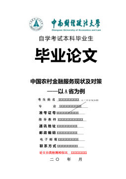 自学考试本科毕业生毕业论文中国农村金融服务现状及对策——以A省为例考生姓名XXXXXXXXXXXXXX专业XXXXXXXXXXXXXX准考证号XXXXXXXXXXXXXX指导教师XXXXXXXXXXXXXXXX通讯地址XXXXXXXXXXXXX邮政编码XXXXXXXXXXXXX电子邮箱XXXXXXXXXXXXX联系方式XXXXXXXXXXXXX论文自我检测相似比XXXXXXXXXX二○年月小三号宋体加粗毕业论文原创性声明本人郑重声明:所呈交毕业论文,是本人在指导教师的指导下,独立进行研究工作所取得的成果。除文中已经注明引用的内容外,本论文不包含任何其他人或集体已经发表或撰写过的作品成果。对本文...