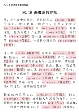 在恶魔岛游戏《NO10》中,一位国王拥有强大的统治力,但他并不真正统治,而是某庞大机构(institution)的董事长。他以无形的王冠“crown”为我戴,用讽刺语气建议我接受他为我挑选的食物(mutton羊肉),任何争端都会加剧他的恶性情绪。这里的一切规则都是他个人的意志,他通过“sarcastic”和“subtle”的方式压迫我,用暴怒、拳头、猛击等手段掌控我。他玩心理游戏考验我的忠诚,提出“proposition”,如带我游泳、穿过海湾等,目的是锻炼我,却让我身心俱疲。他最终揭露了我的罪行,决定获得自由,并踏上离开这座岛屿的旅程,逃离地狱。整个故事充满了挑战、痛苦和自由,探讨了个人意志、权力和自由的关系。