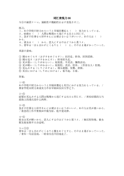 词汇表现力12今日の練習テーマ:個人の願望?欲求?野心の程度を示す表現その三。 1、目指すは、チャンピオンの座と( )。2、スノボの時の( )を直す方法を教えてください。3、こんな結果になるなんて( )ことだ。4、当初は強硬な姿勢を見せていた日本が突如、( )になったのは経済的な問題だろう。5、仲間の成功を( )て見ている。6、西欧諸国は、なぜイスラエルに( )なのですか。 単語の意味: ①口惜しい(くちおしい):遗憾,不甘心。②鼻息が荒い(はないきがあらい):气粗,信心十足,牛气,强势的态度。③及び腰(およびこし):哈着腰,没自信,胆怯。④へっぴり腰(へっぴりごし):撅着屁股的姿...