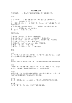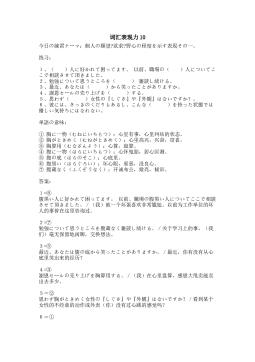 词汇表现力10今日の練習テーマ:個人の願望?欲求?野心の程度を示す表現その一。 练习: 1、( )人に好かれて困ってます。以前、職場の( )人についてここで相談させて頂きました。2、勉強について思うところを( )雑談し続ける。3、最近、あなたは( )から笑ったことがありますか。4、謝恩セールの売り上げを( )する。5、思わず( )女性の『しぐさ』や『外観』はないですか?。6、彼には、さっきのくだりもあるし、こんな( )を持った状態では優しい気持ちにはなれない。 単語の意味: ①胸に一物(むねにいちもつ):心里有事,心里纠结的状态。②胸がときめく(むねがときめく):心里高...