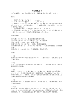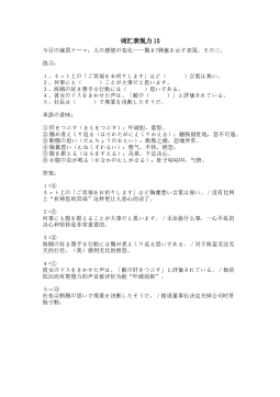 词汇表现力16今日の練習テーマ:人の感情の変化---嫌悪?敵意を示す表現。その一。 练习: 1、集団生活ではワキガは( )られる。2、テクノロジーの進歩に( )人たちがいる。3、韓国で、エレベーターに乗り遅れたことに腹を立てた電動車いすの男性が、エレベーターの外側の扉に( )を繰り返すうちに転落してしまうという事故が発生した。4、彼は眼鏡をはずして看護婦に向かって( )をした。5、何故日本人が宗教を( )するのかというと、マルクス主義を何となく信じちゃったかつての時代の名残り的なものもある。 単語の意味: ①毛嫌い(けぎらい):毫无道理地讨厌某样东东。②白い目を向ける(しろいめをむけ...