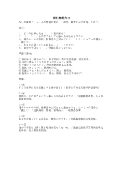 词汇表现力17今日の練習テーマ:人の感情の変化——嫌悪、敵意を示す表現。その二。 练习: 1、どこの世界に夫を( )妻が居る?2、( )は、女の方でもとても強い力が出るものです。3、場のルールや体制、指導者や上司などに( )と、たいていの場合は「損」だ。4、あなたが思っている以上に、( )のです。5、自分の子供を( )母親は見たくないね。 単語の意味: ①歯向かう(はむかう):以牙相向,表示反抗强者,造反抗争。②口汚く罵る(くちきたなくののしる):臭骂。③毛嫌い(けぎらい):没道理地厌恶某人某事。④肘鉄(ひじてつ):胳膊肘打人。⑤足蹴にする(あしげにする):踢人,使阴招。⑥腹黒い(は...
