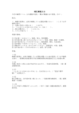 词汇表现力13今日の練習テーマ:人の感情の変化---驚き?興奮を示す表現。その一。 练习: 1、検察の犯罪は、必死で納税している国民が聞いたら( )しそうな不愉快な話だ。2、失敗に気付いた時には( )はずだ。3、「こんなことも分からないのか」と,父は( )。4、癌と診断され、( )になった。5、モラルの低下に( )。 単語の意味: ①目を剥く(めをむく):恼怒,发火,怒目圆睁。②目の前が真っ暗(めのまえがまっくら):失望,绝望,眼前一片漆黑。③血の気が失せる(ちのけがうせる):脸色铁青,煞白,失去血色。④血が逆流(ちがぎゃくりゅう):上火,恼怒。⑤背筋がぞっとする(せすじがぞっとする...