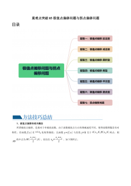 重难点突破05极值点偏移问题与拐点偏移问题目录1、极值点偏移的相关概念所谓极值点偏移,是指对于单极值函数,由于函数极值点左右的增减速度不同,使得函数图像没有对称性。若函数f(x)在x=x0处取得极值,且函数y=f(x)与直线y=b交于A(x1,b),B(x2,b)两点,则AB的中点为M(x1+x22,b),而往往x0≠x1+x22。如下图所示。图1极值点不偏移图2极值点偏移极值点偏移的定义:对于函数y=f(x)在区间(a,b)内只有一个极值点x0,方程f(x)的解分别为x1、x2,且a